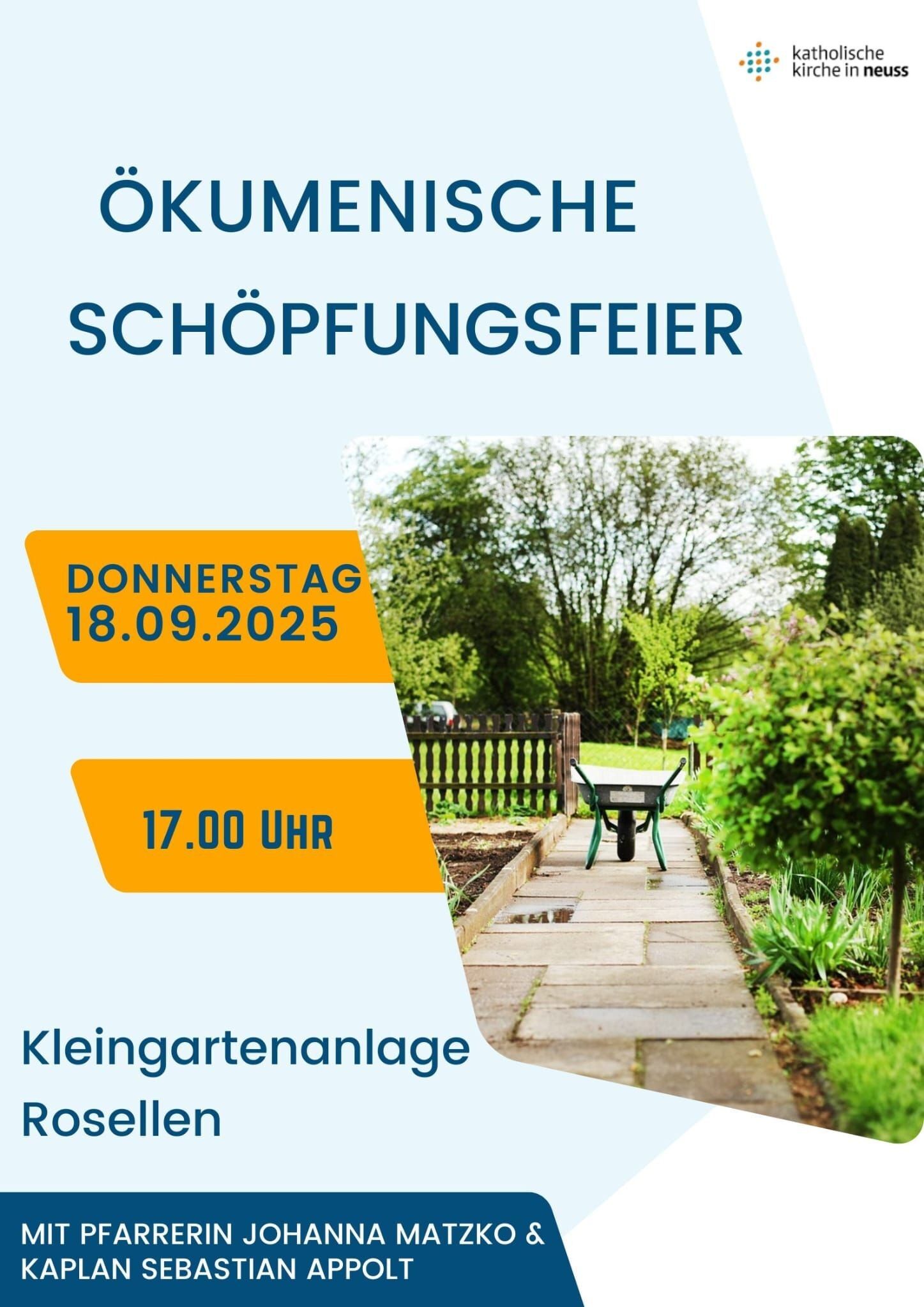 Spätestens jetzt ist es offiziell: wir haben eine neue Tradition in unserer Gemeinde! Zum vierten Mal schon feiern wir Gottes wunderbare Welt mit einer ökumenischen Andacht in der herrlichen Kleingartenanlage in Rosellen. Mitten im Grünen kommt uns Gottes Schöpfung näher, als das in der Stuhlreihe sitzend in der Kirche je möglich ist. Der Wind weht um die Nase, das Zwitschern der Vögel klingt in den Ohren, die Augen gehen einem über vor lauter Blumen. Da kann man sich jede Predigt eigentlich sparen. Aber natürlich werden wir zusammen beten, singen und Gottes Wort hören. Für jeden ist was dabei: Alte, Junge, Junggebliebene, Familien, Kinder… Zuerst gibt es was für Kopf und Herz, danach wird auch der Bauch bedacht: im Anschluss an die Andacht gibt es Snacks und Getränke. Verweilen Sie gerne noch!
